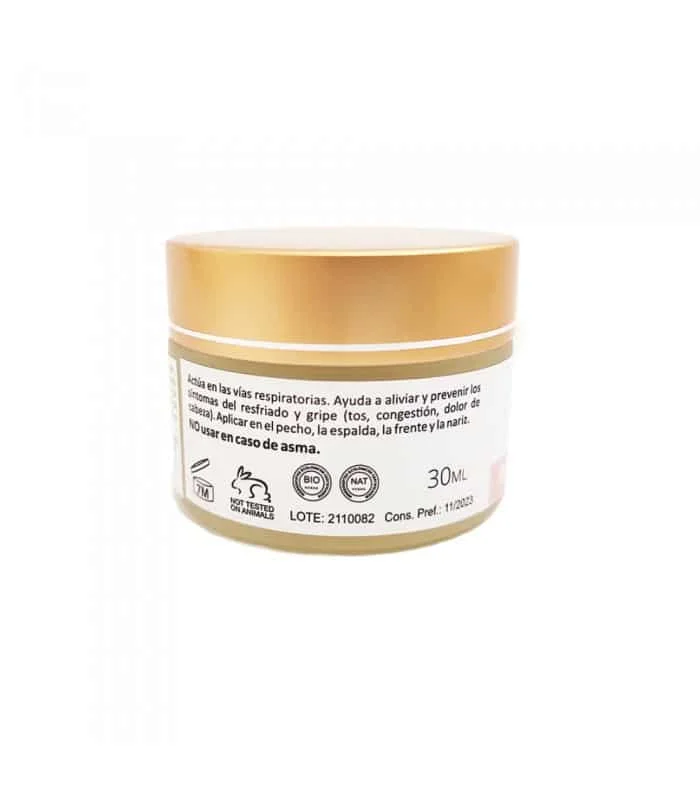 - Alivio natural de la congestión y la tos: Con aceites esenciales de eucalipto y lavanda, este bálsamo relaja y despeja las vías respiratorias de manera efectiva, ayudando a combatir la congestión nasal, la tos y los síntomas asociados a los resfriados.