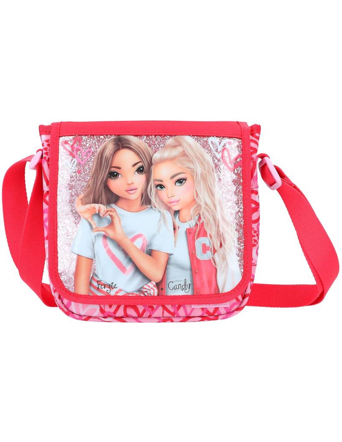 Este bolso bandolera pequeño en tonalidades rojas y rosa preciosas destaca gracias al diseño de dos modelos a tamaño grande sobre fondo con mucha purpurina en la parte delantera y por el estampado a base de corazones monísimos en el resto.
