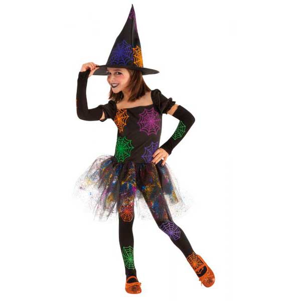 Disfraz de bruja telaraña compuesto de vestido tutú, manguitos impresos, sombrero y medias impresas.
