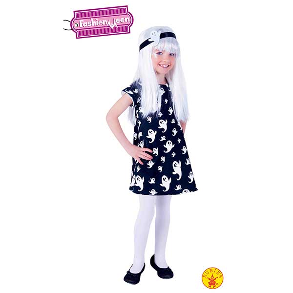 Compuesto por un vestido impreso con bolsillos, cinta para la cabeza con fantasma de fieltro y medias.