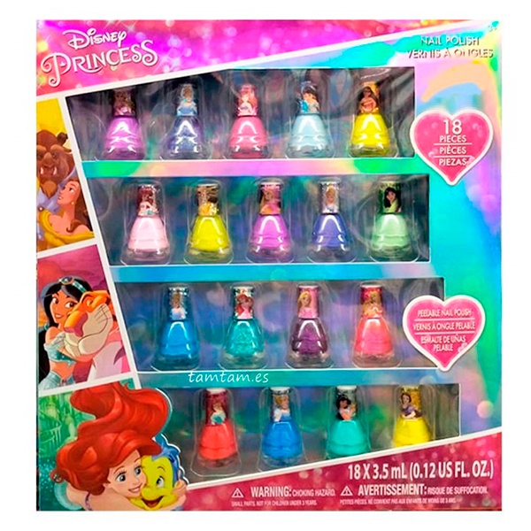 Completo conjunto de 18 esmaltes de uñas infantiles, con una gran variedad de colores diferentes con diseños inspirados en las muñecas de princesas Disney.