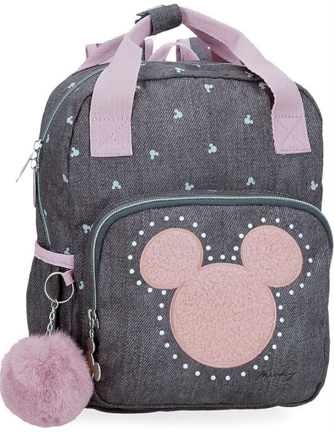 Con un bonito diseño de Mickey Mouse en tonos gris y rosa.La cremallera es metalica y tiene forma de la cabeza de Mickey Mouse.