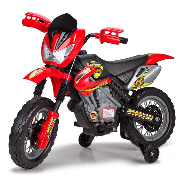 Motorbike Cross 400F que funciona a bateria de 6 Voltios. Alcanza los 3 Km/h y dispone de un sola marcha adelante. Edad recomendada: +3 años. Dimensiones: 102 (L) x 53 (W) x 66 cm (H).
