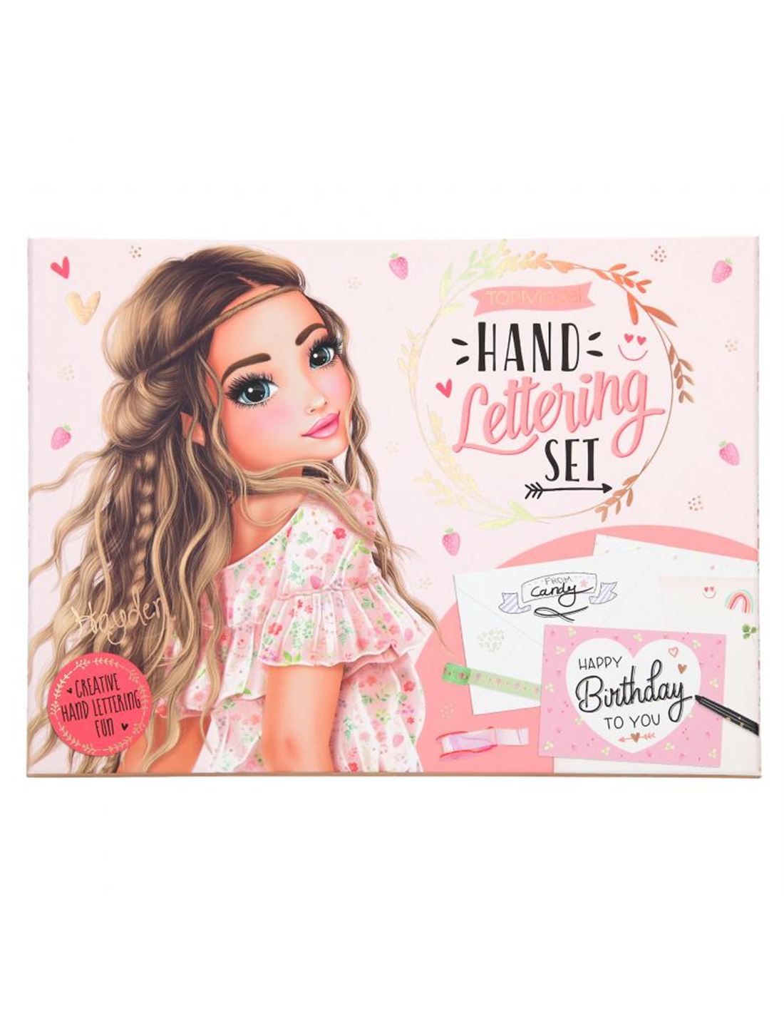 Esta caja creativa de TOPModel contiene todo lo necesario para diseñar cartas y tarjetas preciosas: 10 hojas de papel de carta, 3 hojas de pegatinas (2 de pegatinas doradas y 1 de plateadas), 5 postales, 10 sobres, 1 portarrollos con 4 preciosos rollos de cinta adhesiva decorada, 4 rotuladores (1 rotulador mágico Magic Handlettering y 3 rotuladores de punta doble de color negro, pastell rosa y lila claro), 2 plantillas y 1 librito con instrucciones sencillas.